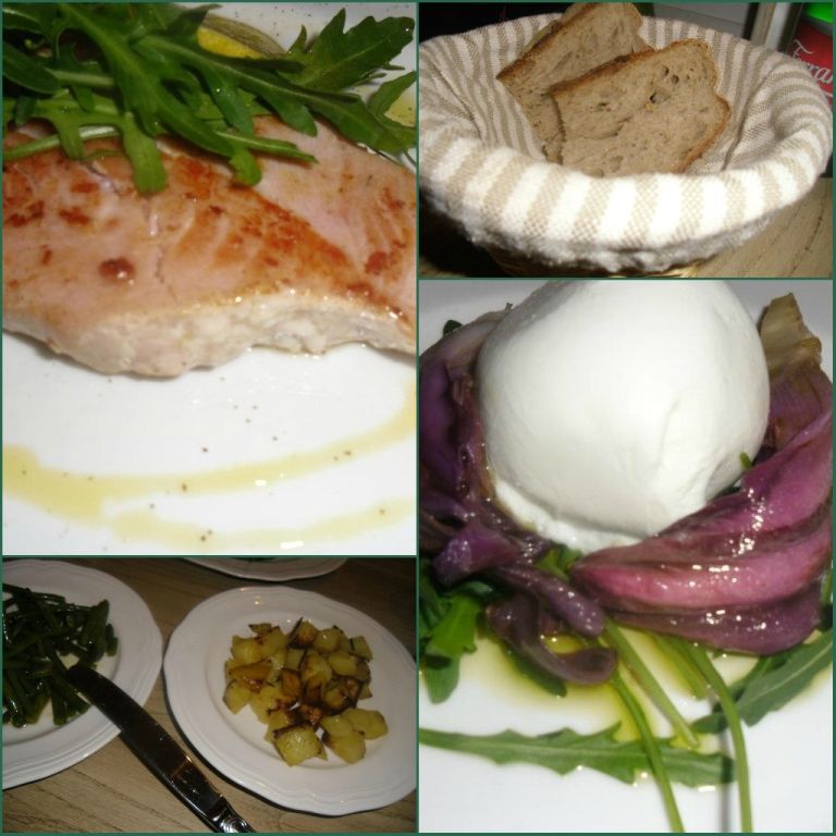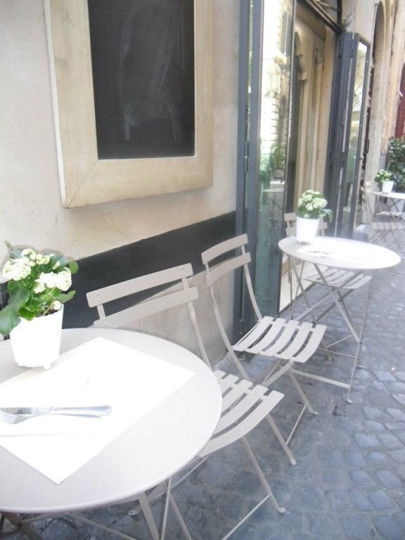 Il bar si trova proprio in via dei Coronari, qualche tavolino in ferro decorato sulla strada, la grande lavagna con le proposte del giorno, aperto dall’ora della prima colazione alle nove di sera. Arredo in legno chiaro, panche e tavoli lungo la parete a mo’ di bistrot, banco caffè e liquori all’ingresso, cucina a vetri in fondo alla sala. A pranzo, oltre ai panini gourmet, un piccolo menu per un lunch veloce o, comunque una pausa non impegnativa: spaghetti alle vongole, zuppetta di ceci, tartare di manzo, carpacci di pesce. La mozzarella di bufala (Paestum) servita con il radicchio confit e il tonno di un bel rosa, appena scottato, non sono niente male, accompagnati dalle verdure del giorno. Si chiude con il tiramisù di Fabrizio.