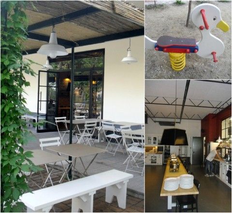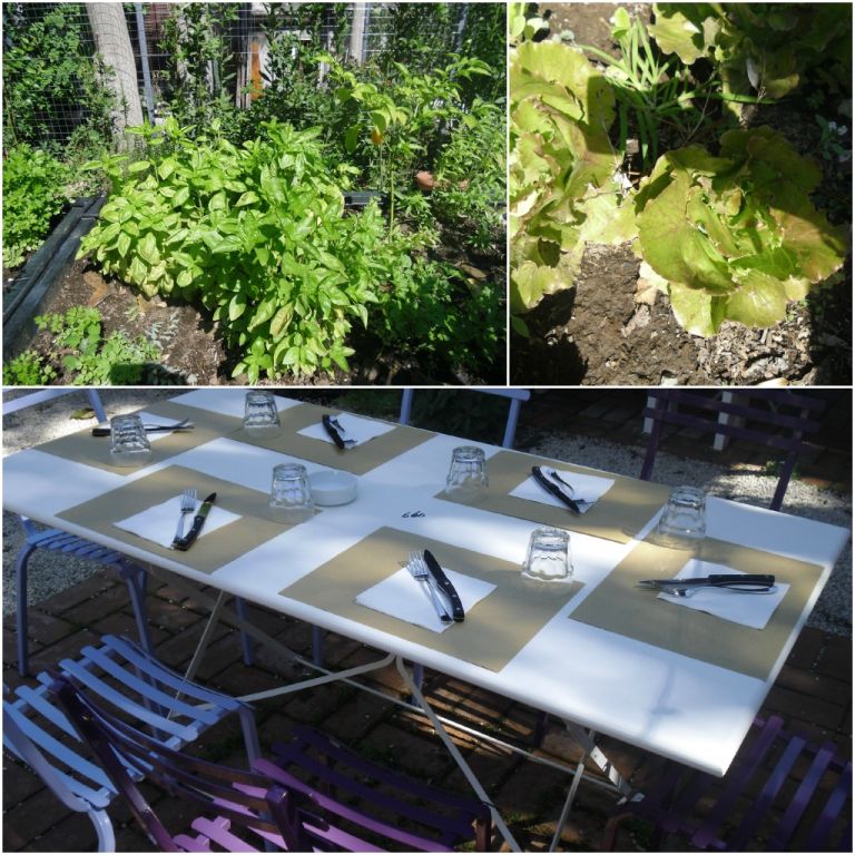 Avendone letto in giro, dunque, ho bypassato a malincuore la colazione da Necci e sono andata a curiosare da Gallotta & C. L’idea, appena arrivi al cancello spalancato su un’enorme area aperta, è quella dello squarcio nel cemento. Ma, soprattutto, di un’oasi di civiltà urbana. Cotto e ciottoli invece dell’asfalto, sedie e tavoli colorati, ombrelloni, un angolo giochi, un orto con insalata e basilico, un campo bocce. E piante che si stanno facendo strada, tra muri e bambini — siamo ancora all’inizio.