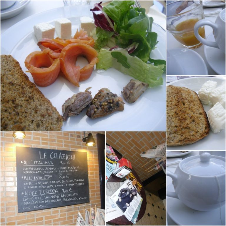 Si può scegliere tra la colazione italiana con caffè o cappuccino, pane burro e marmellata, yogurt e succo di frutta (7 euro) quella inglese con caffè o tè, uova e bacon, salsiccia, pomodoro e funghi grigliati, fagioli e pane tostato (8 euro) quella spagnola con anche la tortilla (8 euro) e quella nordeuropea con caffè o tè, formaggio e pane tostato, salmone e maccarello affumicati (a 9 euro: provata, con grande soddisfazione). Atmosfera rilassata, informale, con quotidiani, settimanali e wi-fi a disposizione per restare collegati con il mondo, ma senza stress.