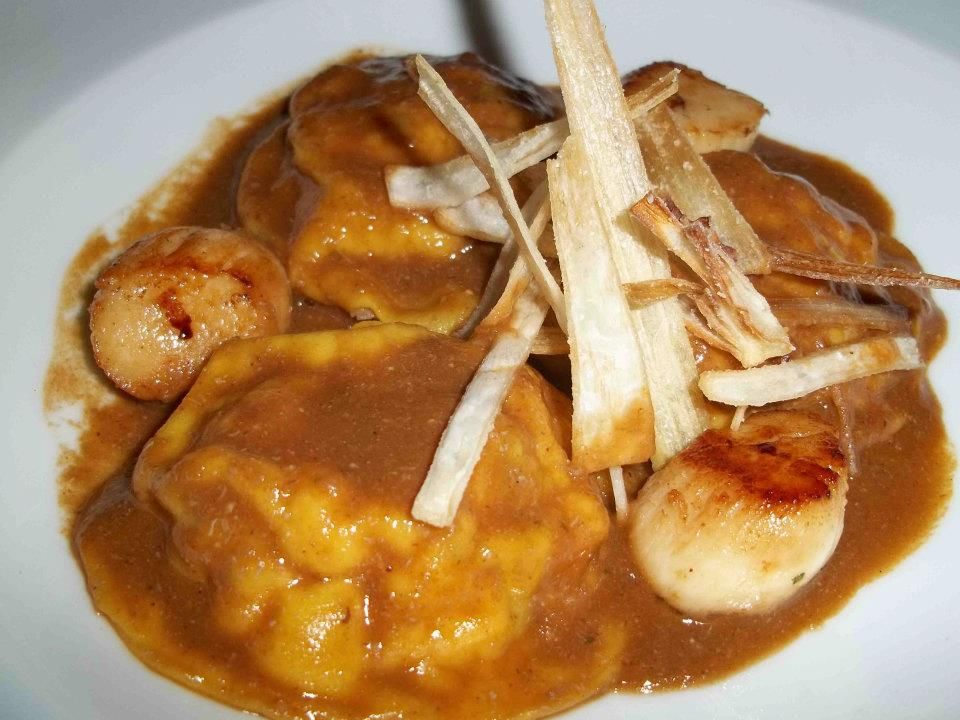 I ravioli di gamberi, astice e scampi di Anzio sono serviti in una salsa densa di mare, profumata al coriandolo e zenzero, che ricorda quasi il fondo di una bouillabaisse. Piatto corposo, pieno, solo un po’ più sapido di quanto avrei preferito.