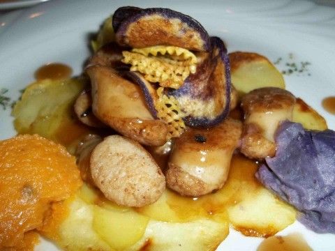 Anche il secondo piatto è molto ricco ed elaborato, una salsiccia di rana pescatrice, servita con patate e crema di lenticchie e zucca.