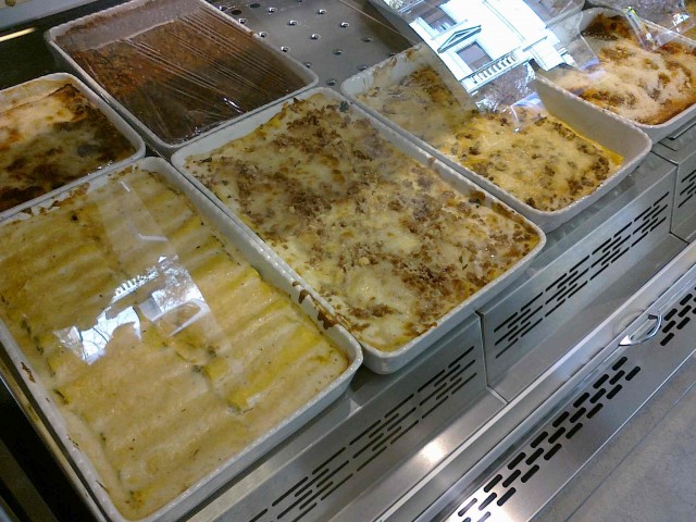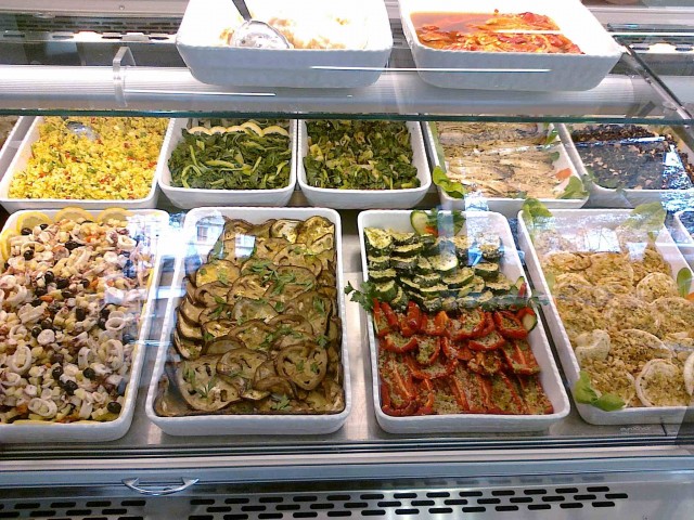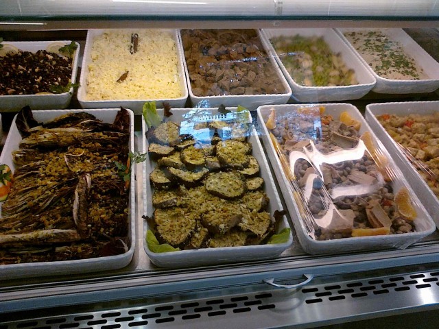 Dall’altra parte della sala i banchi delle meraviglie da asporto. Caldo e freddo. Pirofile di lasagne, pasticci e paste ripiene e al forno, sartu’ di riso. Vassoi di insalate e verdure farcite in tutti i modi possibili.