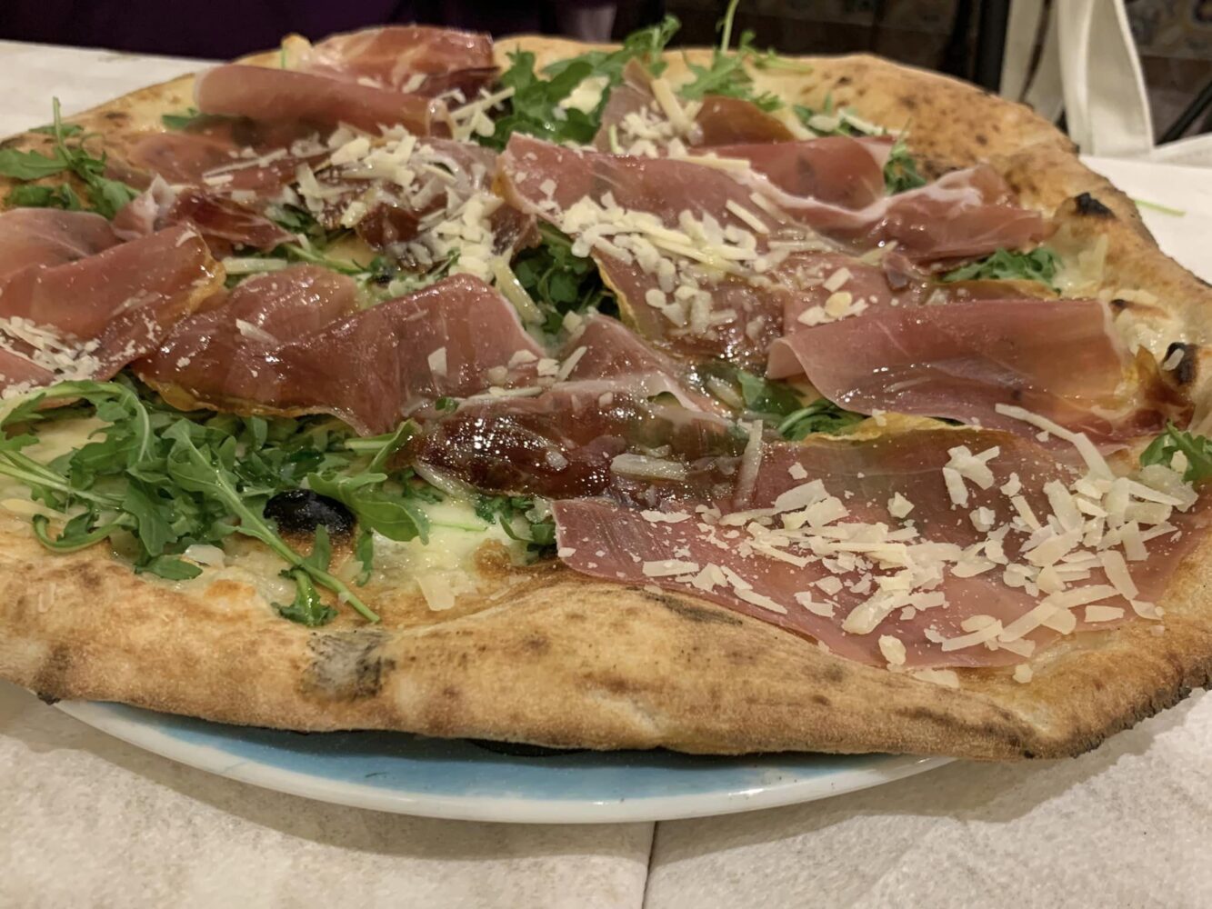 Ma veniamo alla pizza, perché è davvero molto buona. Dimenticatevi dello stile contemporaneo e dei super canotti, qui la tipologia è quella della ‘ruota di carro’: disco di pasta gigantesco, super disteso, che va oltre il bordo del piatto. Cornicione basso e stretto, base sottile. La lavorazione, dunque, così come la lievitazione, seguono la scuola classica, che più classica non si può. Il pizzaiolo, Emilio, lavora qui dall’inizio dell’attività, ma fa il pizzaiolo a Roma da otto anni e difende con convinzione questa tipologia.