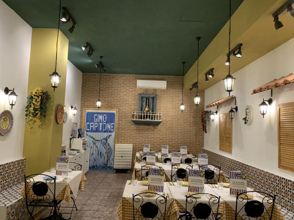 Ambiente e stile parecchio pop, si gioca nell’arredo (e nella comunicazione, molto social) con l’iconografia napoletana di sempre: la sala richiama i cortili con le finestre per l’affaccio e le chiacchiere, le sedie sono in ferro battuto, le panche in muratura rivestite da colorate piastrelle di Vietri sul Mare (stessa ceramica anche per i piatti). E, ancora, limoni, pulcinella, peperoncini appesi e trallalà.