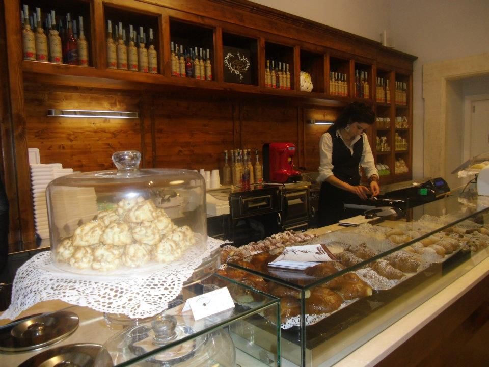 Lo stile è sempre quello elegante e raffinato con i mobili di fine Ottocento che avevamo trovato nella sede catanese. Madie e credenze in legno antico, con un tavolo al centro della stanza con sopra tutti i colori della frutta martorana e dei pasticcini di pasta reale. Anche qui rosoli, pasticceria secca alle mandorle, ai pistacchi, al mandarino, all’arancia; infasciatelli, buccellati, cornetti, cassatelle, olive di sant’Agata, il pesto di pistacchi, i panetti e le creme in barattolo. Dall’altro lato il banco con i dolci freschi, i cannoli, le cassate, le “minne” di Sant’Agata, le brioche da riempire di granita, i lieviti per la prima colazione; con il caffè di cortesia offerto agli ospiti.