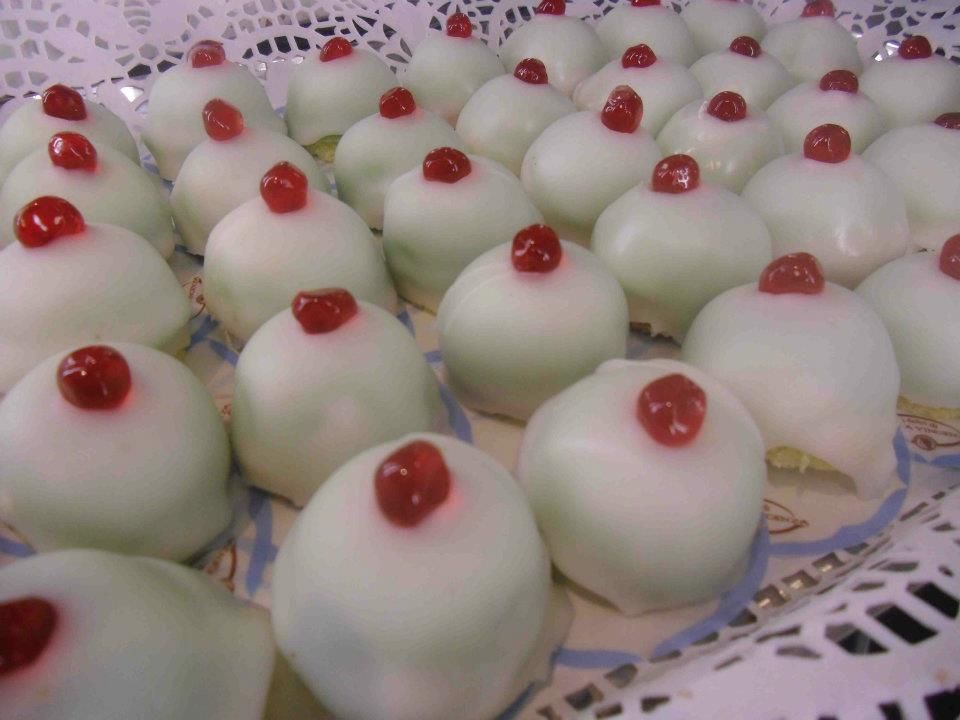 In vetrina, oltre ai vassoi di dolci, sono apprezzabili i centrini ricamati, spero artigianalmente, da nonna Vincenza! :-)