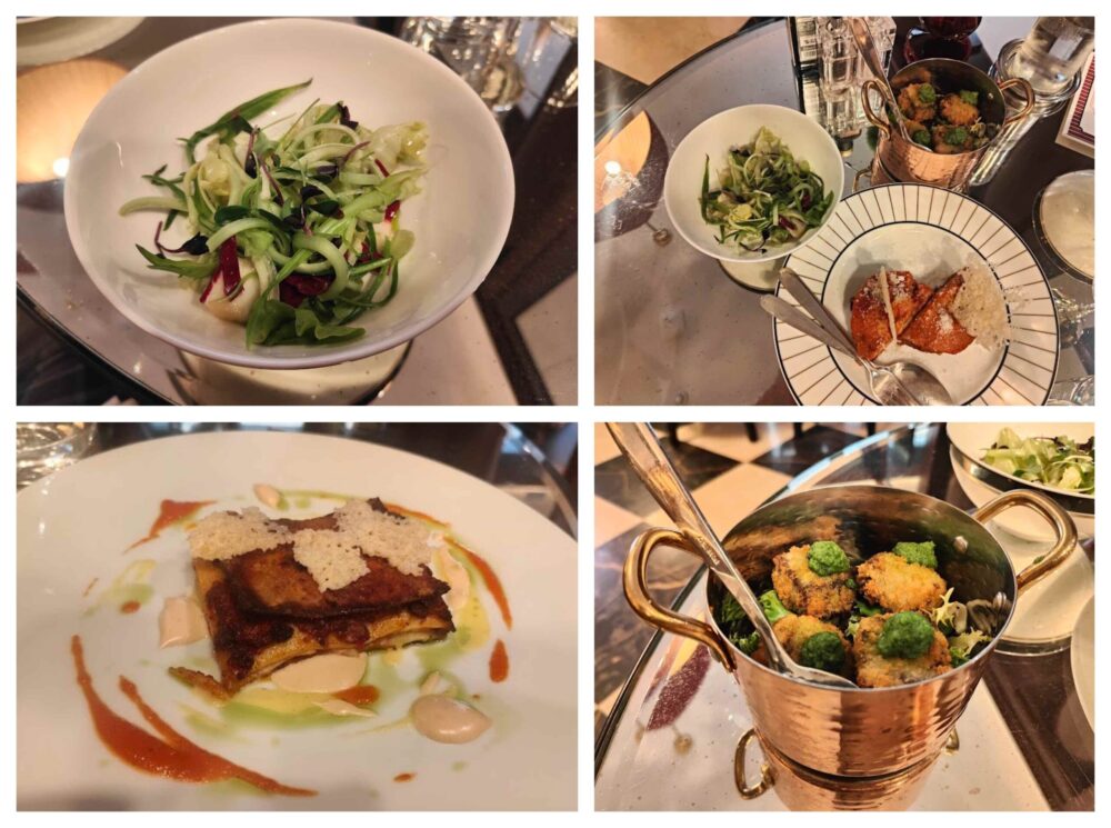 Abbiamo provato il menu della scorsa domenica: Insalata di puntarella con crema di bufala e alici, Polpette di bollito, Zucca alla parmigiana; primi piatti (a scelta tra Lasagna alla bolognese e Ravioli ricotta e tartufo nero di Norcia); secondi piatti (a scelta tra Coscia di pollo al forno e Saltimbocca alla romana); Patate novelle al forno e Misticanza di campo.