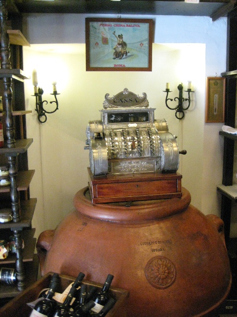 Il locale, originariamente adibito a rimessa di carrozze dei Marchesi Cavalcabò, fu dapprima Osteria e poi, nel 1969, enoteca. Oggi l’ambiente si conserva esattamente come appariva circa cento anni fa, con scaffalature e mobili lignei ed un massiccio bancone in legno intarsiato con ripiano in marmo bianco su cui sono stati posati un’infinità di bicchieri.