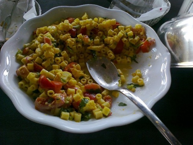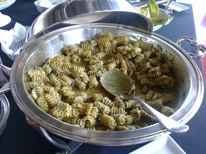I paccheri giganti al pomodoro e basilico hanno una bella faccia, poi ci sono fusilli al pesto e tubetti allo zafferano, anche questi in insalata. Tra i secondi di carne roast beef classico, pollo arrosto e ancora, patate al forno, zucchine grigliate.
