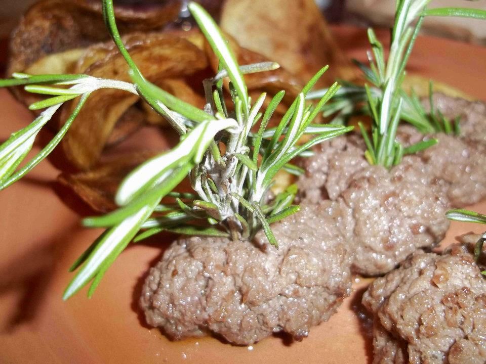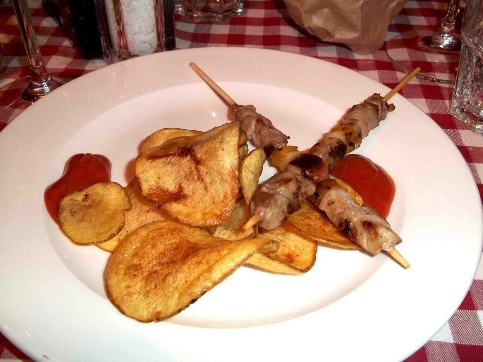 Al nostro tavolo, dopo un gradevole – e gradito – benvenuto con spiedini misti, patate chips e ketchup fatto in proprio, abbiamo provato i pansoti (non male, anche se si sentiva soprattutto la noce moscata, più che le noci della salsa). Molto buona la tartare mediterranea con extravergine, sale, pepe nero, noci, olive, pomodorini, capperi, cetrioli e prezzemolo. Anche le polpette fatte al momento solo con olio e rosmarino restituiscono il piacere di mangiare la carne. Buona, senza bisogno di essere addomesticata. Tenera e saporita la tagliata di fassona, nella versione “nuda”: condita solo con un filo di extravergine e sale grosso. Con il punto di cottura richiesto. Meno efficace invece lo “zuccotto” di pollo con il prosciutto cotto alle erbe (perchè chiamarlo così?): una spadellata di cubetti di pollo e zucchine ricoperto di (troppo) prosciutto arrosto. L’insieme non rende giustizia ai singoli ingredienti, tutti di buona qualità.