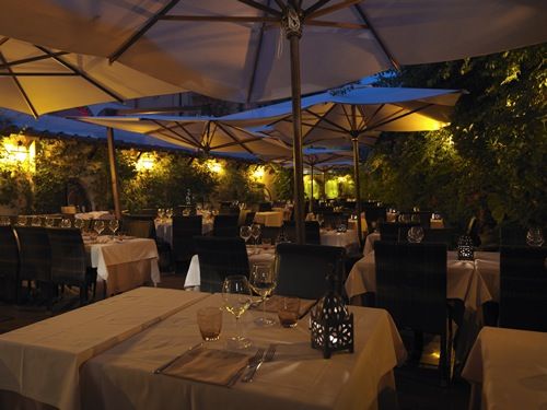 Una sala confortevole con opere d’arte contemporanea e un elegante privè, in un edificio storico. Ma il punto di forza è il giardino interno: stare qui seduti a cena e veder funzionare più di cento coperti alla giusta velocità e cortesia è sempre uno spettacolo. I clienti sono della più varia umanità: star vere o presunte tali, turismo medio-alto, per capirci, di quelli che ancora mettono una collana di perle o una giacca (e non infradito birkenstock) per andare a cena fuori, c’è la famiglia alto-borghese con il figlio dodicenne dotato di prematuri gemelli ai polsini della camicia; ma anche tavolate di giovani in jeans e teschi d’ordinanza sulle t-shirt. Tutti accolti con indiscutibile mestiere.
