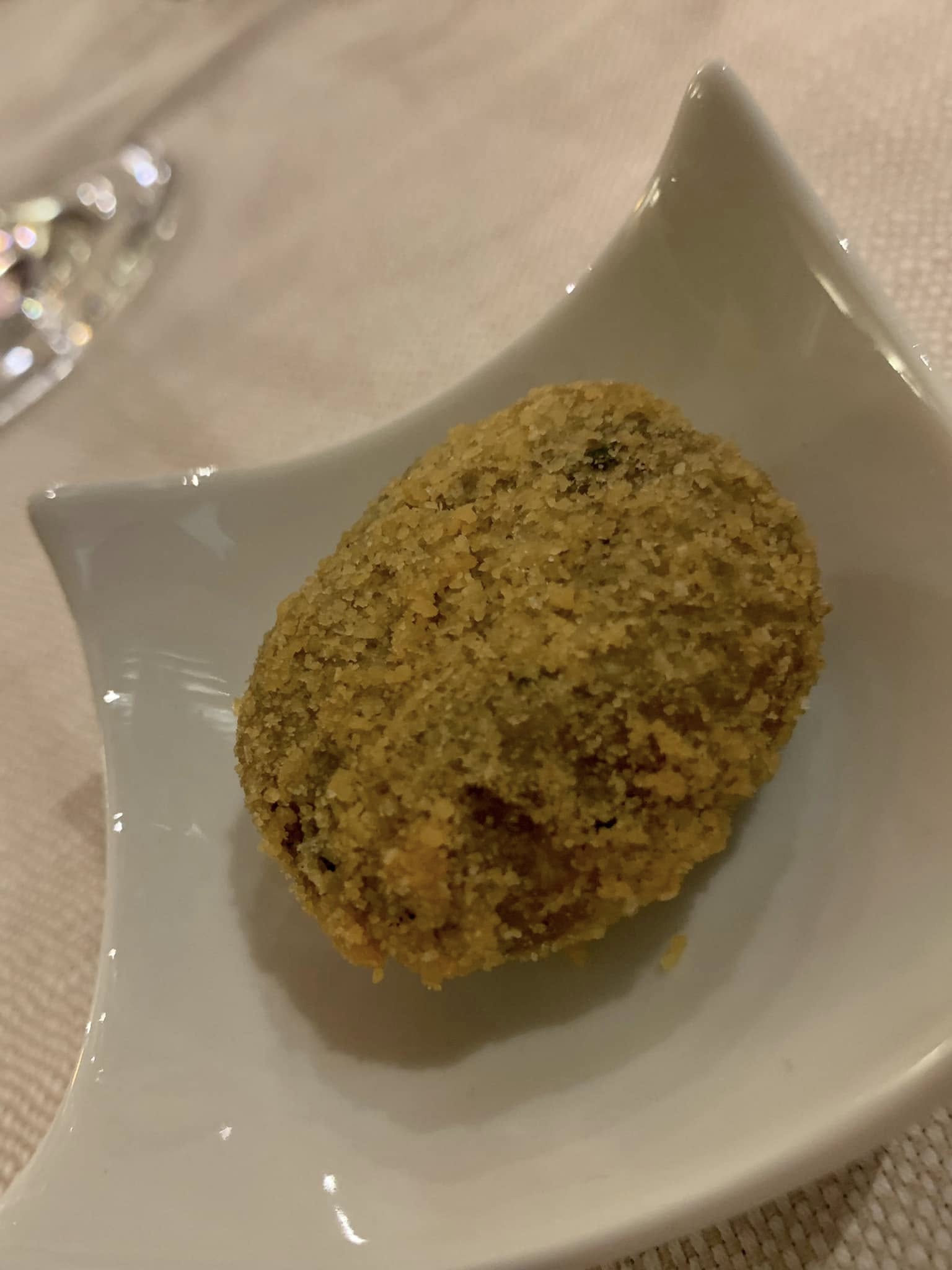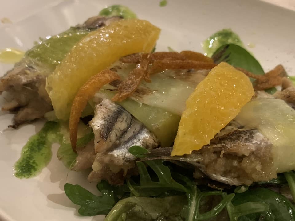 Per cominciare, tra gli antipasti, una vignarola completa di tutti gli ingredienti, di grande soddisfazione, preparata praticamente come a casa. E delle gustose alici imbottite al profumo di agrumi, avvolte in foglie di porro e servite su un’insalatina di arance, lattuga e radicchio.