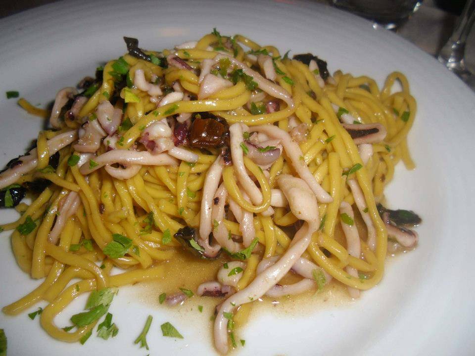 Molto buoni, tra i primi piatti, quelli che col tempo sono diventati il vero e proprio must dell’osteria: i tagliolini all’uovo con calamari e pomodori secchi, piatto ricco e succulento, ben equilibrato. Meno convincenti i paccheri con la pescatrice, perchè il sugo di pomodoro e soprattutto il formaggio (troppo) finiscono per coprire completamente il sapore di un pesce, peraltro grasso, e che quindi se la cava benissimo quasi da solo.