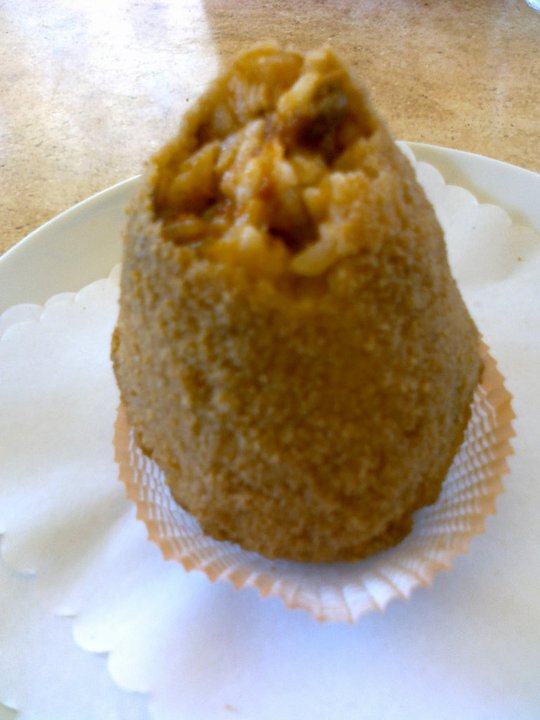 Già. L’arancino. Quello al ragu’ è veramente notevole, il riso è cotto al punto giusto, la crosticina è sempre croccante e golosa e il sugo con la carne mai stucchevole. Niente di meglio per una pausa pranzo, ottima via di fuga dai milioni di focacce e panini scongelati in ogni dove, grazie a piastre sbruciacchianti più vecchie di mia nonna.