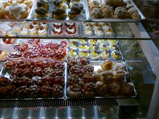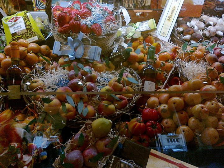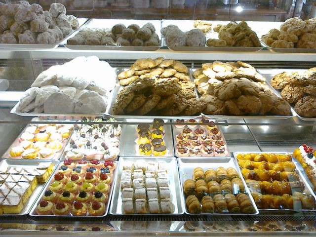 E poi, il trionfo barocco della pasticceria siciliana: cannoli, dolcetti secchi di mandorle, cassate e cassatine, torte alla frutta e semifreddi. In questi giorni di dicembre, poi, il banco dei gelati (molto buoni) è sostituito da una cascata colorata di frutta martorana.