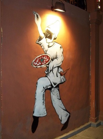 Ambiente incasinatissimo e variopinto, pieno di ninnoli, cartoline d’epoca di Napoli, acquari veri e finti. Subito la gigantografia del Pulcinella dipinto sulla parete esterna al confronto vi sembrerà una figura stilizzata postmoderna. Tavoli numerosi e vicini distribuiti su due sale, ma il servizio è rapido e molto cortese. Grande simpatia e partecipazione dei pizzaioli – manualità e cuore napoletano – che riescono a fare e infornare pizze senza perdere una battuta dei tavoli più vicini.