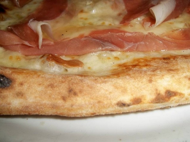 La base del disco di pasta è sottile, con un cornicione classico napoletano per dimensioni, cioè poco pronunciato ma leggermente più croccante rispetto a quello che potete trovare in una pizzeria del centro storico di Napoli. Nel complesso una pizza ben lievitata e digeribile.