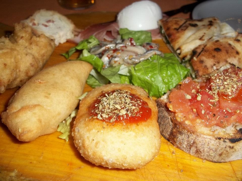 Classico partenopeo il gustoso antipasto: boccone di calzone con mozzarella e rucola, torta rustica di ricotta e salame, montanara con l’origano, bruschetta con pomodoro fresco, piccolo calzoncello fritto con la mozzarella, pasta cresciuta col cavolfiore, prosciutto e mozzarella di bufala, alici marinate (ma un po’ troppo “acetose” per i miei gusti).