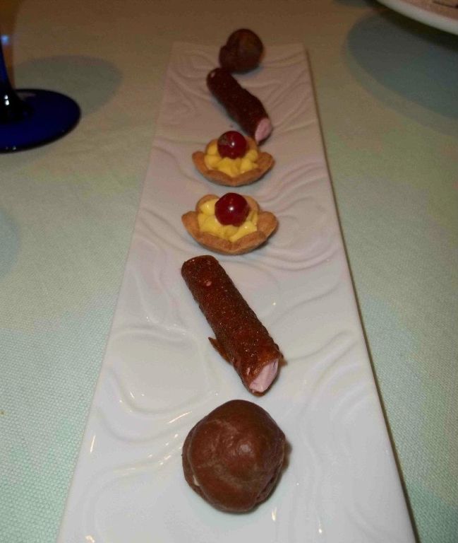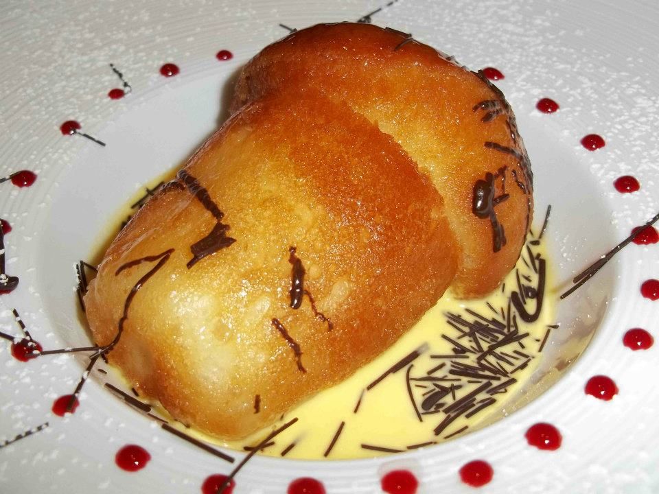 Si può chiudere con il classico millefoglie, la variazione di cioccolato, la composta di sorbetti oppure, se alla vista della parola babà il vostro ricordo si fa struggente come succede a me, tuffarvi in questa pasta leggerissima alla crema inglese. Il momento finale dolce è ovviamente comprensivo di predessert e piccola pasticceria.