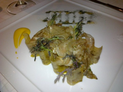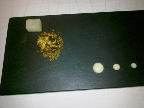 Verifica finale sul risotto, cotto e mantecato in modo eccellente, buona l’idea dei cachi per l’acidità e il contrasto. Anche in questo caso c’è però alla fine un eccesso di dolce, la toma prevale riportando l’inizio della lingua protagonista, frenando la salivazione e conferendo così un senso circolare al piatto anziché spinta dinamica. Forse un riequilibrio andrebbe meditato invertendo i ruoli tra il frutto e il formaggio trasformando questo in comprimario. Ma qui, ovviamente, è un gusto personale, a scanso di equivoci voglio dire che siamo di fronte ad una eccellente esecuzione.