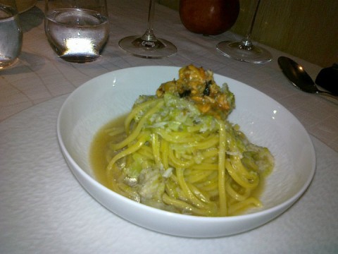 Piatto perfetto, di grande equilibrio, il finocchietto e il sapore sapido del consommé di razza (il mare a sorsi) valorizzano le cozze e il broccolo romano. Non è facile raggiungere queste vette con gli spaghetti. A noi hanno ricordato quelli di Gennaro con l’ostrica, particolarmente virtuoso l’essere riuscito a mantenere la cottura perfetta nonostante il liquido di fondo: avete presente l’astronave terrestre che riesce ad abbandonare quella degli extraterrestri in Indipendent Day? Beh, qui più o meno è andata così. Tutto il resto esplode in bocca in maniera golosa e fine, persistente e intensa. Davvero un piatto appassionante.