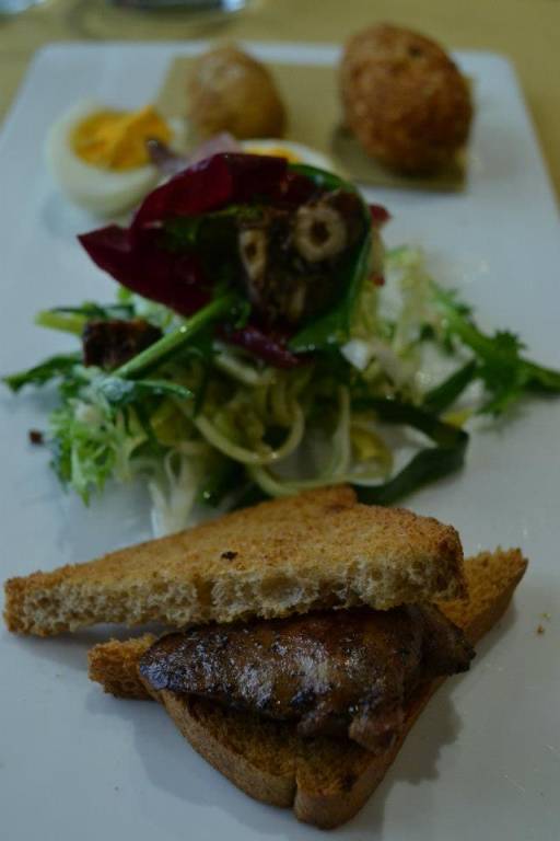 Antipasto, Viaggio a Rocca Priora: l’insalata di erbe amare, radici, pangiallo e acciughe; le uova sode e le fette biscottate con il fegato di coniglio burro e salvia, la crema fritta con la mescola di pecorino, zucche e cannella, il supplì di riso