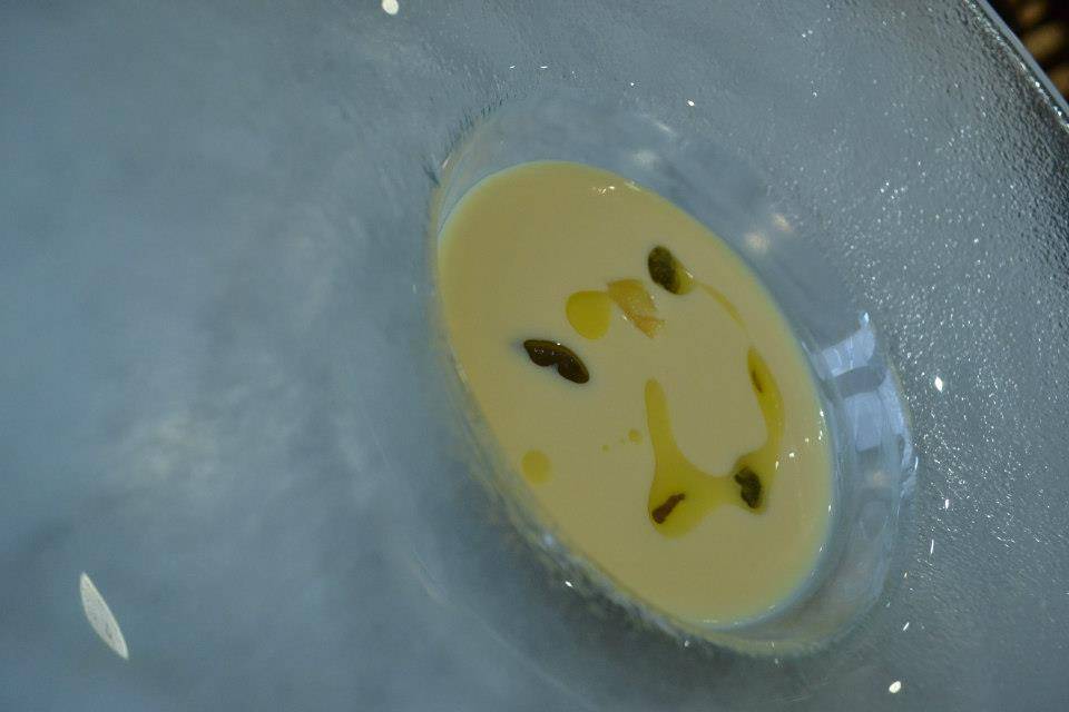 Il dessert chiude il pasto in maniera raffinata e divertente: cioccolato bianco liquido, capperi, zenzero e olio extravergine d’oliva.