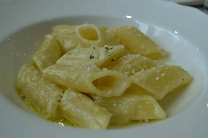 E poi le fette biscottate, compagne dell’ora della merenda da bambino anche se non accompagnate da fegato di coniglio con burro e salvia, come genialmente sono proposte, poi l’uovo sodo con acciuga sotto sale e la crema fritta con la mescola di pecorino ed ancora il supplì di riso. Difficile la scelta del primo, il menù decanta una serie di paste tipiche della cucina romanesca e qualche ottima minestra: spaghettoni all’amatriciana con pomodorino del piennolo, rigatoni alla carbonara, pennoni pepe bianco pecorino e olio alle erbe, tagliatelle di Campofilone con ragout di rigaglie di pollo, minestra di pasta e patate e saraghe, minestra di legumi dell’alto viterbese. Il dito si sofferma decisamente sui pennoni cacio e pepe dove la cottura della pasta è impeccabile e il gusto più che soddisfatto.