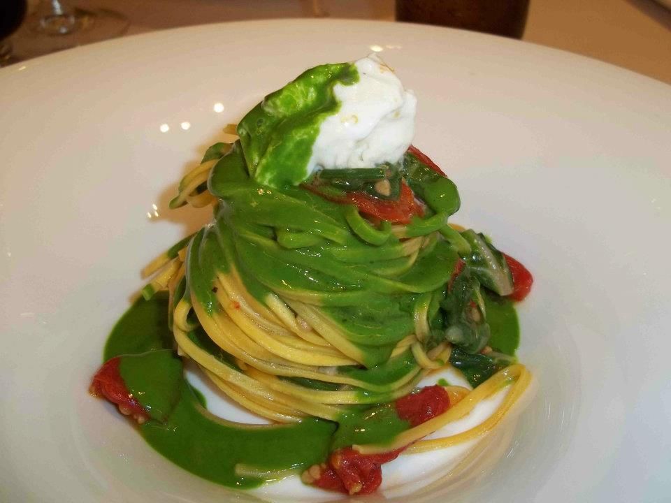 Molto freschi e indovinati anche gli spaghetti alla chitarra del menu “Un attimo”, le due portate con calice di vino che Metamorfosi propone a pranzo al costo di 35 euro. Un piatto verde bianco e rosso che avvolge e penetra nella pasta fresca: bietoline, burrata e pomodori passiti. E come secondo, una julienne di tonno rosso condita con gel balsamico alle erbe aromatiche e crema gelata di castagne.