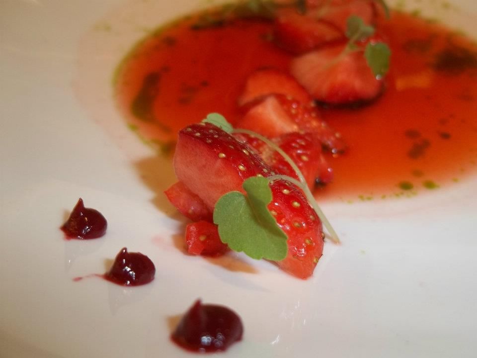 Il «gesto goloso di italianità» con la “Scarpetta”: zuppetta tiepida di fragole fragole fresche, basilico greco, crema di limone e mascarpone gelato; il tutto con una finta mollica di grano saraceno alla vaniglia.