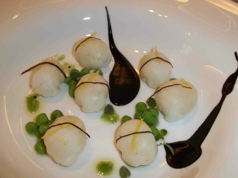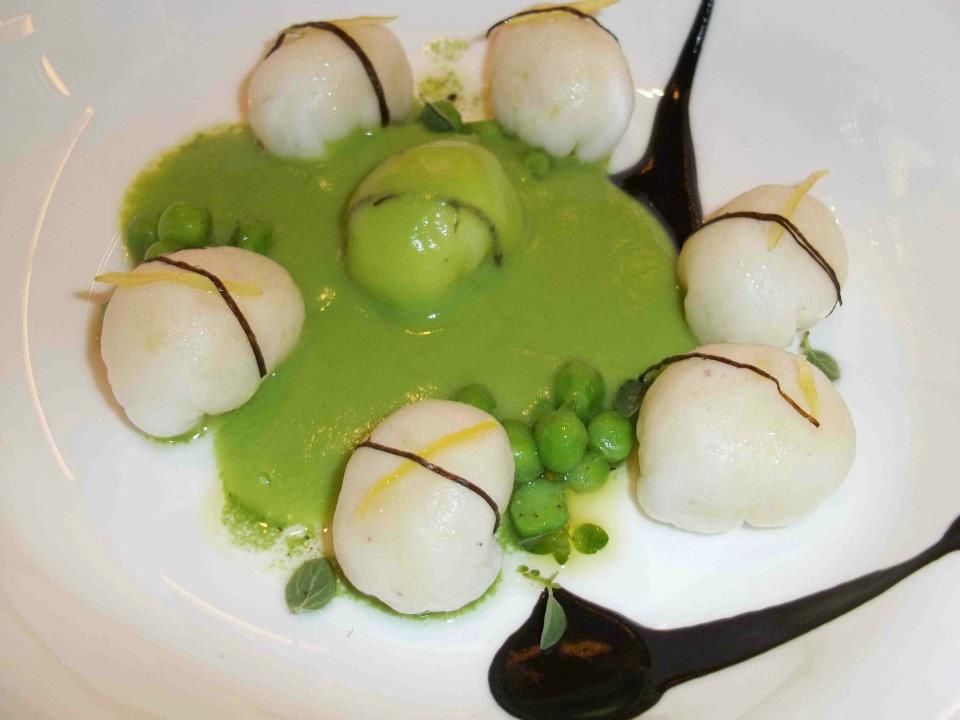 Il primo piatto lo ricorderò per la nettezza cromatica pari a quella dei sapori: gnocchi di seppia, con ripieno di patate all’olio e piselli verdi, verdissimi, croccanti e in crema. Un filo impercettibile di buccia di limone a dare slancio al piatto. Gnocchi felici e contenti di farsi abbracciare dai piselli e del nero della seppia.