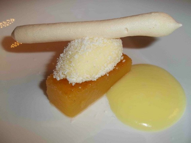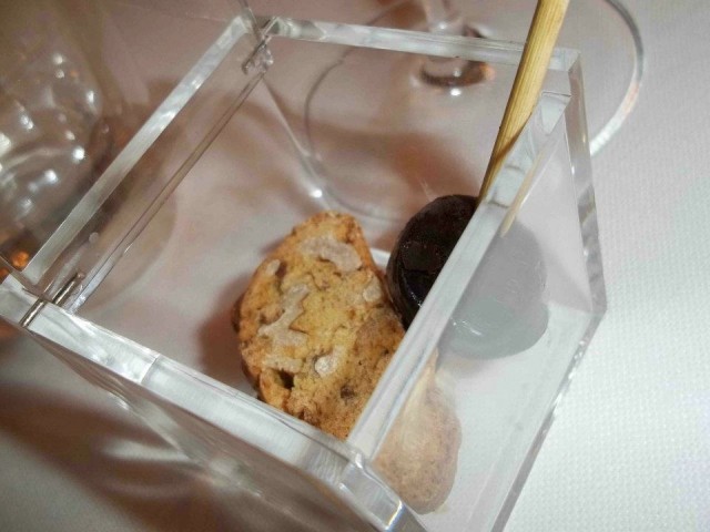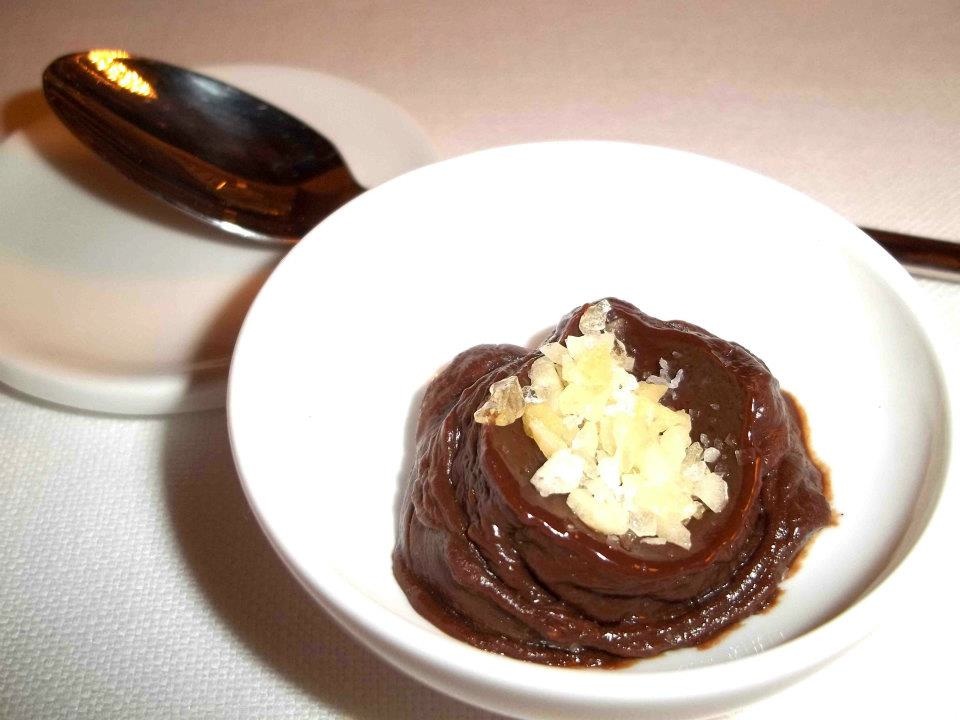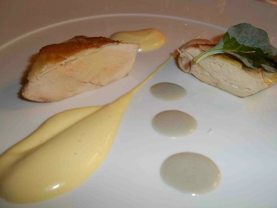 Il secondo piatto di carne è un petto di pollo di Bresse scottato con la sua pelle croccante, servito con una foglia di erba ostrica, una maionese casalinga espressa, fresca e lieve e rinvigorito da qualche goccia di ostrica frullata. La sapidità iodata tratta con il dovuto rispetto questa carne eccezionale nella sua semplicità. E poi che bello ritrovare nell’alta cucina il petto di pollo!