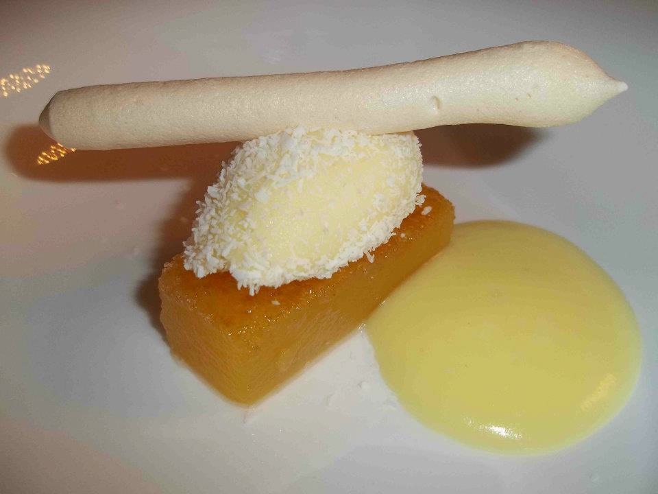 Chiudiamo la degustazione con una crema alla gianduia servita con del sale scoppiettante (grazie all’anidride carbonica solleticherà anche i vostri denti) e un dessert cento per cento ananas in versione “pina colada”: con uno spicchio di frutto sciroppato, in gelato con del cocco, in crema col rum e in meringa.