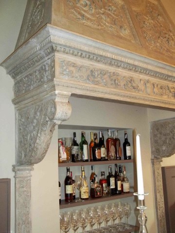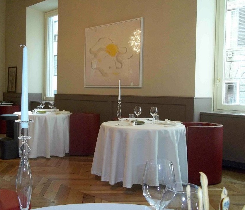 Uno scrigno, come quello dei sogni, questa piccola elegantissima sala con soli sei tavoli. Poltroncine in pelle rossa, pavimento in legno, soffitto a cassettoni, tovaglie candide. Un camino monumentale che custodisce decine di distillati. Il servizio, impeccabile ma sempre divertito e personalizzato è curato direttamente dal padrone di casa. Da sempre, per lui o è così o non è. Dalla gestione della sala dipende tutto. «La cucina può sbagliare, la sala no» è una delle sue convinzioni. Grande professionalità, battuta pronta, conoscenza profonda e orgogliosa di vini e prodotti.