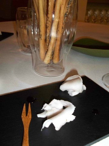 Il benvenuto è una declinazione della dolcezza più golosa: quella di due fettine due di lardo di patanegra servite con dei grissini al sesamo ancora caldi. Così sei davvero pronto a cominciare il viaggio. Tutto il resto è fuori insieme allo sciopero, al traffico, alla recessione.