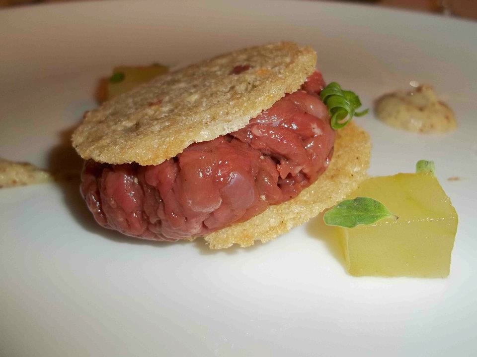 A questo punto è davvero come avere le coordinate giuste prima di affrontare un viaggio. Insomma. Si può partire. Crudo di oca. Arriva un piccolo hamburger di carne cruda di oca chiuso da due crostini semi-trasparenti con una salsa a base di senape per nulla aggressiva e dei freschissimi cubotti di mela verde marinata. La carne è eccezionale e il piatto nel complesso per nulla banale, anche con un abbinamento così semplice. Il frutto pulisce il palato senza fare molta fatica: non c’è grasso e non c’è stucchevolezza.