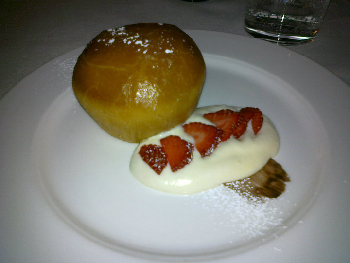 Molto delicato e ben lievitato il babà al rum con crema e fragole
