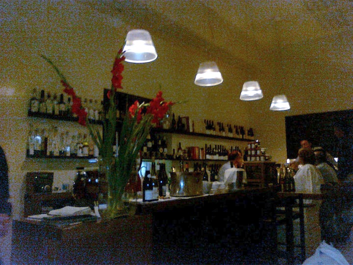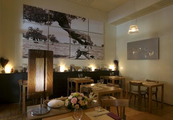 Arredo semplice ed essenziale tra scaffali di libri e bottiglie, un angolo bar e una sala con il bancone pasticceria. E che bello ritrovare in vaso i gladioli, fiore nostrano diventato demodè dopo l’invasione asiatica delle orchidee ikebanate (sembra che nessuna ristrutturazione di hotel o ristorante riesca a farne a meno).