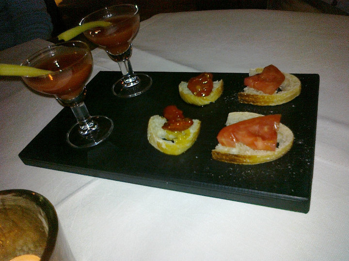 Mentre riflettete sul da farsi, un piccolo aperitivo (pensiero gentile che non trovate nel conto) con un bicchierino di Bloody Mary e del pane e pomodoro. Si. Pane e pomodoro. Tanto per non dimenticare chi siamo e da dove veniamo.