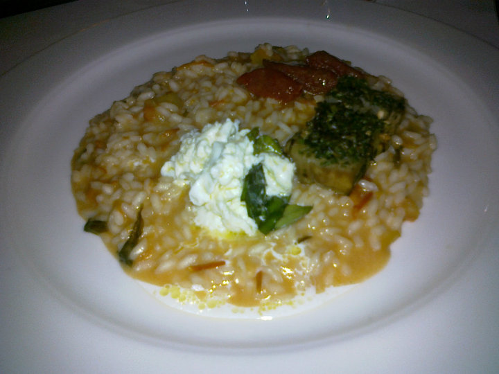 Abbiamo provato un risotto alla parmigiana di melanzane, ben eseguito, divertente, servito con sopra gli ingredienti della parmigiana scomposta. Un gioco, ma anche una lezione, sui sapori base della nostra mediterraneità.