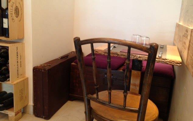 Dove prima c’era l’All’Oro, infatti, oggi c’è questo delizioso locale, arredato con gusto, con i colori del legno vero: quello dei tronchi per i tavoli, piccoli ma comodi, e quello delle cassette dei vini, a segnare le pareti e fare da scaffale alle bottiglie.