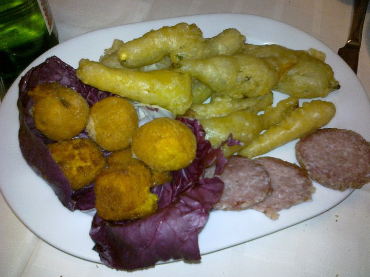 Abbiamo chiesto di cominciare come da tradizione, con i fritti (crema anconetana, olive ascolane e verdure in pastella) e il ciauscolo, salame fresco marchigiano che ben si accompagna al pane con poco sale (molto buono, 2 euro a persona, in pratica è il coperto che troverete nel conto). La qualità è buona, il fritto delicato. Tra i primi impossibile rinunciare alla specialità della cucina: il tortello gigante con ripieno al rosso d’uovo.