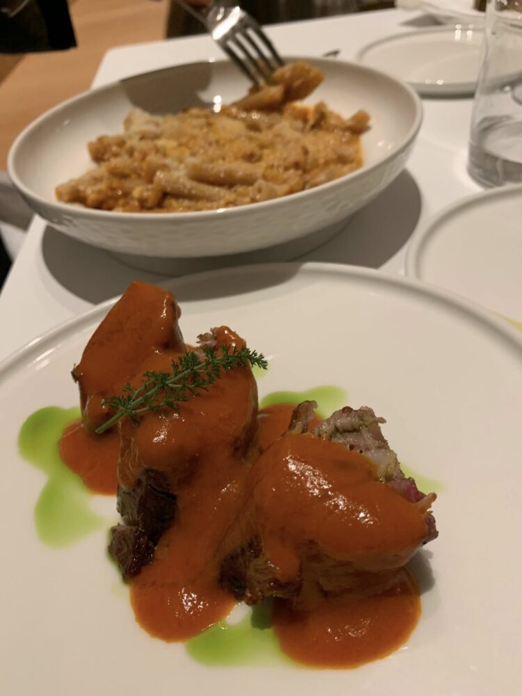 Ed ecco, ancora, i piccoli rigatoni con il sugo (da pomodori vesuviani) degli involtini alla romana, in servizio di porcellana elegante, ma con l’idea vincente – e rustica – di tenere insieme primo e secondo in un sol piatto. Oppure la magnifica tajine di vitello, con cipolle rosse di Tropea e un mix di spezie del Nord Africa.