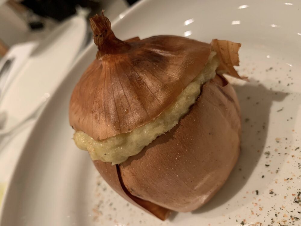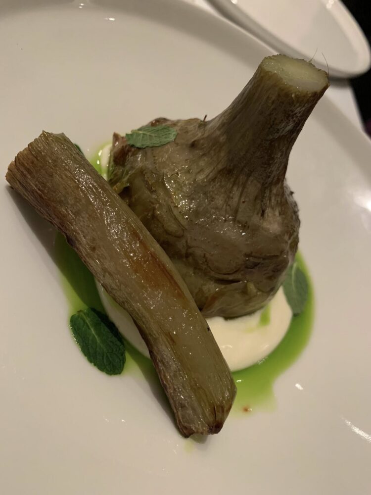 Tra gli antipasti, un carciofo della tradizione su crema di pecorino, cotto alla perfezione; l’uovo reso goloso dalla crema di patate di Avezzano e poi la cipolla “Onion surprise”, farcita con baccalà mantecato. Che sapori. E che prodotti. La gioia di condividere questi piatti si legge al banco e tra i tavoli, mentre si passa dal granello di sabbia di Nico Fidenco all’assolo di chitarra di Hotel California. Qui si stecca davvero tutto, pure la musica.