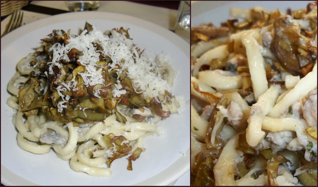In carta c’è sempre un piatto del giorno (a 10 euro), come ad esempio quello provato da ultimo: i “tramezzini” di patate con besciamella e prosciutto cotto, rassicurante, quasi un piatto dell’infanzia – accompagnati da broccoli in padella. Le verdure qui da Uve e Forme non sono mai un semplice accompagnamento di carne e pesce, ma il loro ruolo decisivo in molte ricette le trasformano in veri e propri piatti unici. Da provare lo sformato di zucca e amaretti con guanciale croccante, piatto equilibrato con la morbidezza della zucca registrata grazie agli amaretti e contrastata dal grasso e dalla sapidità del guanciale; oppure gli strozzapreti con alici, carciofi e pecorino, piatto ricco e ben riuscito.