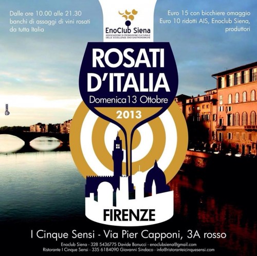 Un buon successo per l'interessante manifestazione “Rosati d'Italia” svoltasi a Firenze domenica 13 Ottobre, all'interno delle splendide sale del ristorante “I Cinque Sensi”. Un particolare plauso va a Davide Bonucci, presidente dell'Enoclub Siena, grande esperto ed appassionato dell'universo vino organizzatore di eventi sempre ben confezionati, all'interno dei quali si degusta ma soprattutto si va ad approfondire stili e territori vitivinicoli toscani e non solo.