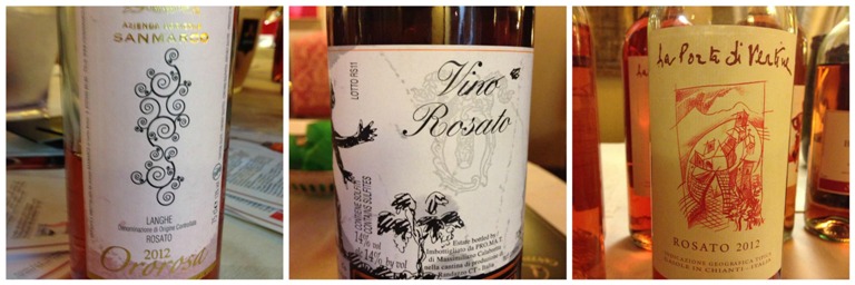 da sinistra: Rosato Langhe doc Ororosa 2012 di San Marco, Vino Rosato di Calabretta e Rosato igt 2012 di La Porta di Vertine