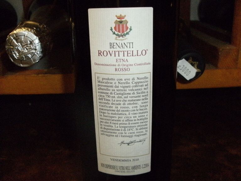 Il Rovittello Etna Rosso Doc 2010, blend di nerello mascalese all’80% e saldo di nerello cappuccio con quest’ultimo che modera gli eccessi tannici del primo, ha ottenuto la seconda piazza da parte della giuria nazionale all’ultima edizione di Radici del Sud. Circa due anni di maturazione tra acciaio, barrique e vetro. Tasso alcolometrico che raggiunge i tredici gradi e mezzo.
