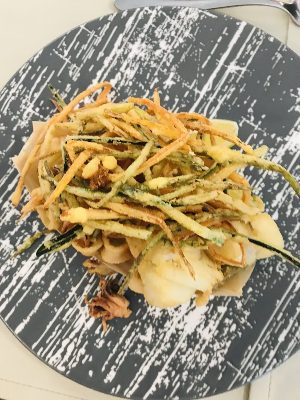Anche una “semplice” frittura di baccalà e calamari – buona già di suo – diventa ancora più gustosa servita con impalpabili melanzane napoletane (ora ultime di stagione ) fritte con le carote.