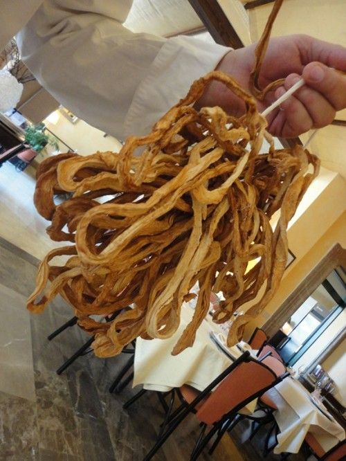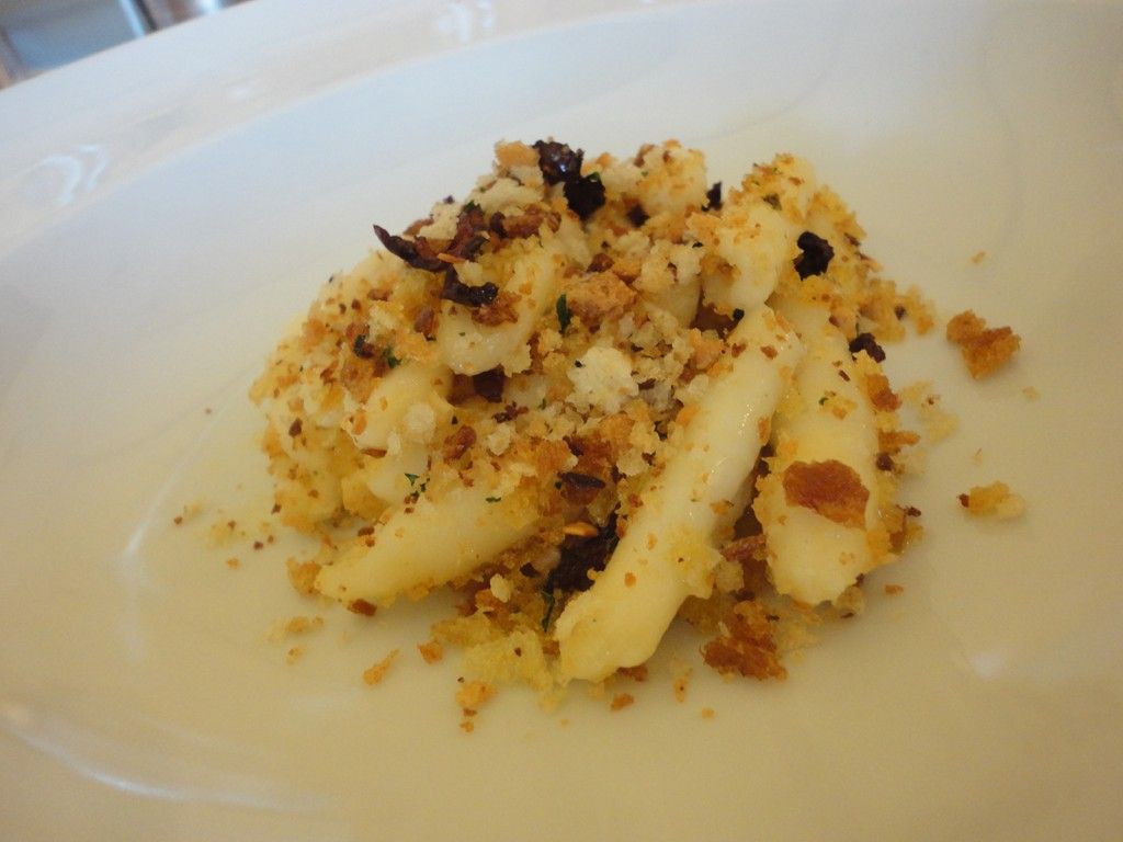 E anche qui siamo al tripudio della materia prima e dei sapori ancestrali. Innaffiamo con Joaquin 203(il produttore dice che il numero è la sigla del progetto, non replicabile)da vitigno Fiano di Avellino annata 2007 Lapio, contrada Campore. Un vino ottenuto con criomacerazione fatta e dichiarata(quindi non c’è trippa per gatti), fermentato in legno d’acacia austriaca, due mesi di affinamento sulle fecce fini, e via in bottiglia. Pensato per abbinamenti su piatti strutturati, con dolcezza e morbidezza, da contrastare con la sapidità e l’acidità che certo non difettano in questo vino. Fa proprio al nostro caso!!! Per primo piatto ci arriva ” Lu Trieddo”.